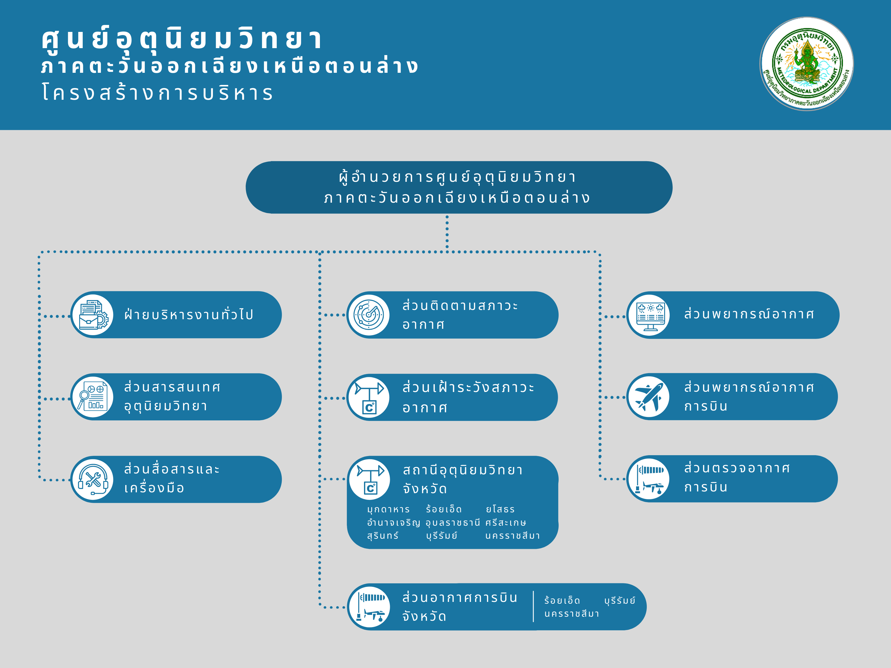 ประวัติ หน้าที่รับผิดชอบ หน่วยงานในสังกัด โครงสร้างการบริหาร โครงสร้างบุคลากร วิสัยทัศน์ และ ภารกิจ แผนที่ศูนย์อุตุนิยมวิทยา งบประมาณ กิจกรรม